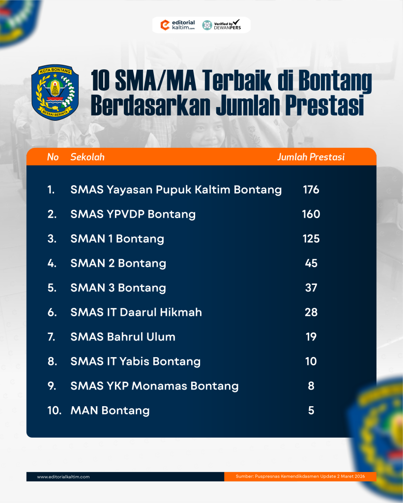 Editorialkaltim.com – Sejumlah sekolah menengah atas di Kota Bontang mencatatkan capaian prestasi yang cukup menonjol dalam berbagai ajang kompetisi siswa tingkat daerah hingga nasional. Data tersebut tercatat dalam sistem pemetaan prestasi yang dikelola Kementerian Pendidikan Dasar dan Menengah (Kemendikdasmen).