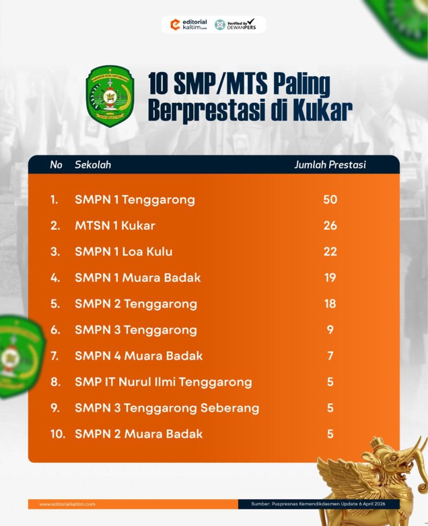 Editorialkaltim.com – Kementerian Pendidikan Dasar dan Menengah (Kemendikdasmen) melalui Pusat Prestasi Nasional (Puspresnas) merilis data terbaru capaian prestasi siswa tingkat SMP di Kabupaten Kutai Kartanegara (Kukar). Data yang diperbarui per Senin (6/4/2026) ini memotret sekolah-sekolah dengan jumlah prestasi terbanyak berdasarkan catatan resmi pemerintah.
