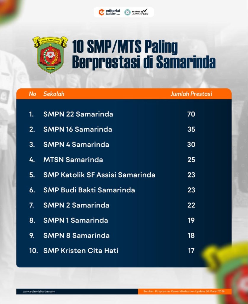 Berdasarkan pembaruan data per 30 Maret 2026, terdapat 10 SMP/MTS di Samarinda dengan jumlah prestasi tertinggi. Posisi teratas ditempati SMPN 22 Samarinda dengan total 70 prestasi.