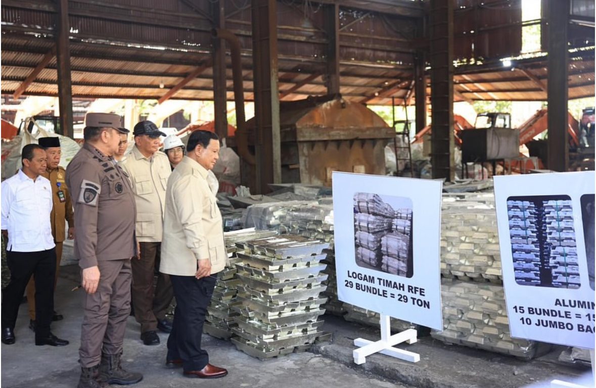 Prabowo saat menyerahkan barang hasil rampasan negara dari kasus tambang ilegal kepada PT Timah Tbk di Pangkal Pinang, Bangka Belitung,…