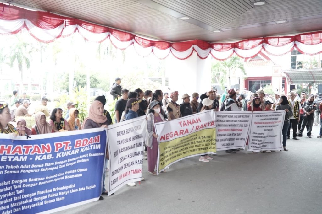 Editorialkaltim.com – Ratusan warga dari Masyarakat Hukum Adat yang berada di sekitar Hak Guna Usaha (HGU) PT Budi Duta Agromakmur (BDA) menggelar aksi demonstrasi di depan Kantor Bupati Kutai Kartanegara (Kukar), Senin (4/8/2025). Mereka menuntut pencabutan izin usaha perkebunan milik PT BDA yang dinilai merugikan masyarakat dan menelantarkan lahan selama bertahun-tahun.